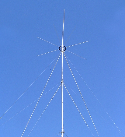 Bottom view of the Sirio 827 5/8 wave. Each section of the mast is guyed four way and it's stable as a rock. All guys are twisted stainless steel. |