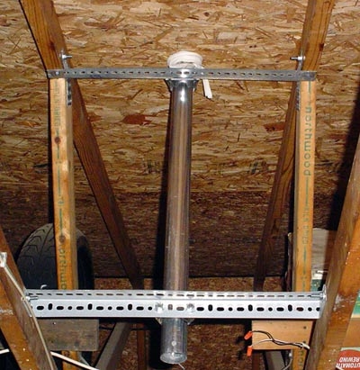 Another view of the telescoping mast socket. The socket itself is a piece of exhaust pipe sized for a good fit on the bottom section of the mast. Both braces are double bolted into the trusses for strength. So far so good - it's survived 65mph straight line winds. |